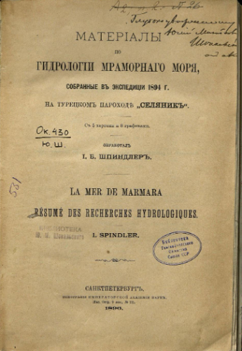 Материалы по гидрологии Мраморного моря, собранные в экспедиции 1894 г. на турецком пароходе "Селяник" / обраб. И.Б. Шпиндлер. - Санкт-Петербург : Тип. Имп. Акад. наук, 1896