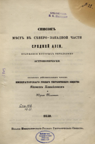 Список мест в северо-западной части Средней Азии, положение которых определено астрономически / Сост. действительными членами ИРГО Яковом Ханыковым и Юрием Толстым. - [Санкт-Петербург] : ИРГО, 1850