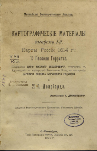Даниловский, Анатолий Алексеевич (1845-1917). Картографические материалы. Вып. 1 : Карты России 1614 г. : 1) Гесселя Герритса 2) П. Дейриарда. / исслед. А. Даниловского. - Санкт-Петербург : Воен.-учен. ком. Гл. штаба, 1901