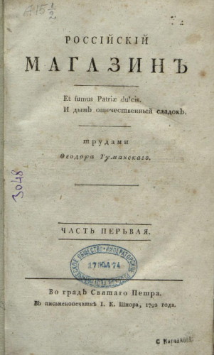 Российский магазин. Ч. 1. / трудами Федора Туманского. - Во граде св. Петра : Письменопечатня И.К. Шнора, 1792