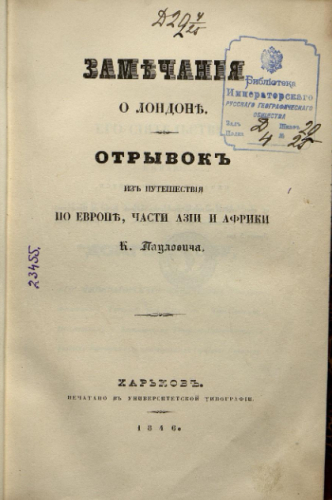 Паулович, Константин Павлович (1781-186?). Замечания о Лондоне : Отрывок из Путешествия по Европе, части Азии и Африки / [Соч.] К. Пауловича. - Харьков : Унив. тип., 1846