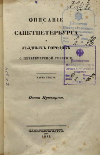 Пушкарев, Иван Ильич (1808-1848). Описание Санкт-Петербурга и уездных городов С.-Петербургской губернии. Ч. 3. / [Соч.] Ивана Пушкарева. - Санкт-Петербург : Тип. Губ. прав., 1841