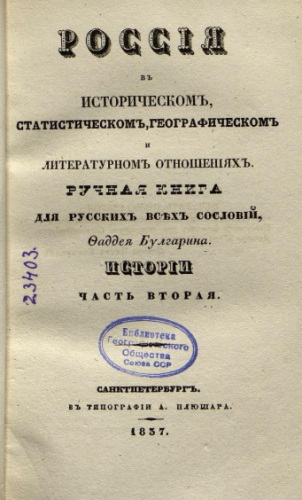 Булгарин, Фаддей Венедиктович (1789-1859). Россия в историческом, статистическом, географическом и литературном отношениях : История. Ч. 2 / Ручная книга для русских всех сословий, Фаддея Булгарина. - Санкт-Петербург : Тип. А. Плюшара, 1837