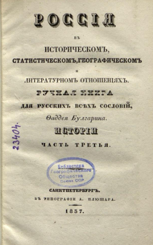 Булгарин, Фаддей Венедиктович (1789-1859). Россия в историческом, статистическом, географическом и литературном отношениях : История. Ч. 3 / Ручная книга для русских всех сословий, Фаддея Булгарина. - Санкт-Петербург : Тип. А. Плюшара, 1837