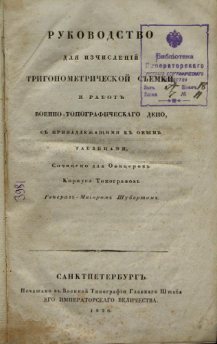 Шуберт, Федор Федорович (1789-1865). Руководство для исчислений тригонометрической съемки и работ Военно-топографического депо : с принадлежащими к оным таблицами / соч. для офицеров Корпуса топографов генерал-майором О. Шубертом. - Санкт-Петербург : Воен. тип. Гл. штаба, 1826