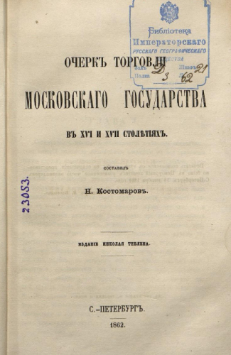 Костомаров, Николай Иванович (1817-1885). Очерк торговли Московского государства в XVI и XVII столетиях / Сост. Н. Костомаров. - Санкт-Петербург : Изд. Николая Тиблена, 1862