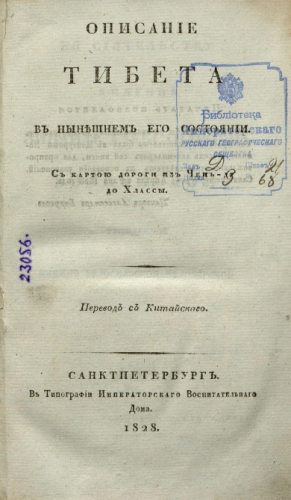 Лу Хуа-чжу. Описание Тибета в нынешнем его состоянии : С картой дороги из Чен-ду до Хлассы / Пер. с кит. [Иакинфа (Бичурина, Никиты Яковлевича)]. - Санкт-Петербург : Тип. Имп. Воспитательного дома, 1828