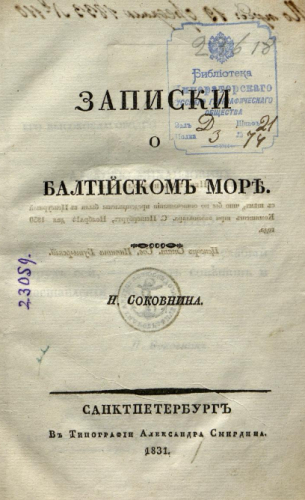 Соковнин, Николай Михайлович (1811-1894). Записки о Балтийском море / [Соч.] Н. Соковнина. - Санкт-Петербург : Тип. А. Смирдина, 1831