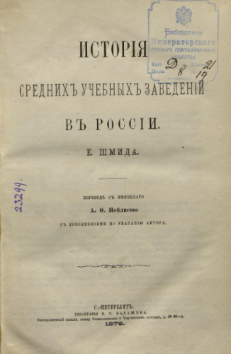 Шмид, Георг Карлович (1836-1912). История средних учебных заведений в России / [соч.] Е. Шмида ; пер. с нем. А.Ф. Нейлисова с доп. по указ. авт. - Санкт-Петербург : Тип. В.С. Балашева, 1878