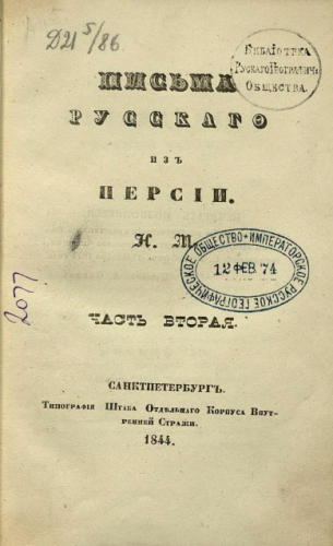 Масальский, Николай Федорович (1812-1880). Письма русского из Персии. Ч. 2. / Н.М. - Санкт-Петербург : Тип. Штаба Отдельного корпуса внутренней стражи, 1844