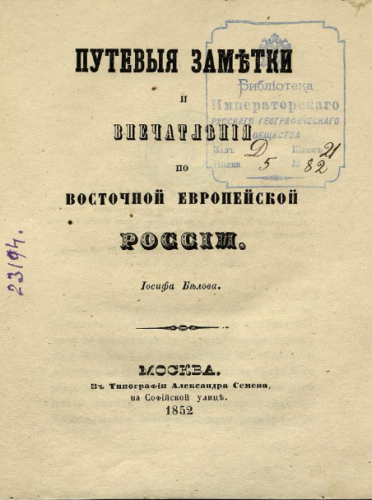 Белов, Иосиф. Путевые заметки и впечатления по восточной Европейской России / [Соч.] Иосифа Белова. - Москва : Тип. А. Семена, 1852