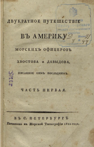 Давыдов, Гавриил Иванович (1784-1809). Двукратное путешествие в Америку морских офицеров Хвостова и Давыдова. Ч. 1. / писанное сим последним. - Санкт-Петербург : Мор. тип., 1810