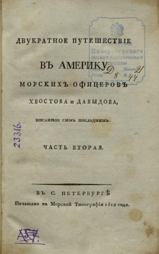 Давыдов, Гавриил Иванович (1784-1809). Двукратное путешествие в Америку морских офицеров Хвостова и Давыдова. Ч. 2. / писанное сим последним. - Санкт-Петербург : Мор. тип., 1812