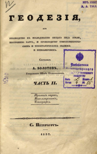 Болотов, Алексей Павлович (1803-1853). Геодезия, или Руководство к исследованию общего вида земли, построению карт, и производству тригонометрических и топографических съемок и нивелировок. Ч. 2 : Проекции карт. Нивелирование. Топография. / Сост. А. Болотов, Ген. штаба подполк. - Санкт-Петербург : Тип. К. Вингебера, 1837