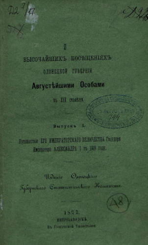 О высочайших посещениях Олонецкой губернии августейшими особами в XIX столетии : Ист. сб. Вып. 1 : [Путешествие е.и.в. государя императора Александра I в 1819 году]. / Издание Олонецкого губерн. Стат. комитета. - Петрозаводск : Губерн. тип., 1877