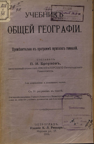 Броунов, Петр Иванович (1853-1927). Учебник общей географии : применительно к программе мужских гимназий / Сост. П.И. Броунов, засл. проф. Имп. Петрогр. ун-та. - 5-е изд., испр и доп. - Петроград : К.Л. Риккер, 1916