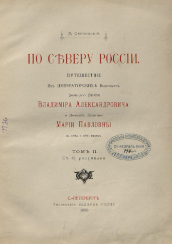 Случевский, Константин Константинович (1837-1904). По Северу России. Т. 2 : Путешествие их императорских высочеств великого князя Владимира Александровича и великой княгини Марии Павловны в 1884 и 1885 годах / К. Случевский. - Санкт-Петербург : Тип. Эдуарда Гоппе, 1886