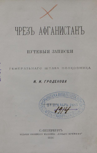 Гродеков Н.И. Через Афганистан : Путевые записки Ген. штаба полковника Н.И. Гродекова. - Санкт-Петербург : Издание кн. маг. "Нового времени", 1880