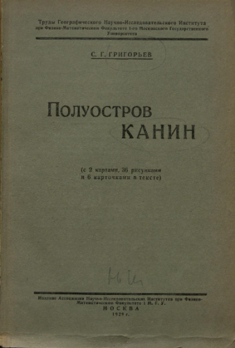 Григорьев, Сергей Григорьевич (1874-1931). Полуостров Канин. Т. 1. / С.Г. Григорьев. - Москва : Изд. Ассоц. Научно-исслед. инст. при Физико-мат. фак. МГУ, 1929