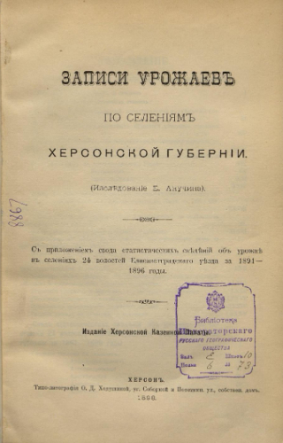 Записи урожаев по селениям Херсонской губернии : (Исслед. Е. Анучина) : С прил. свода стат. сведений об урожае в селениях 24 волостей Елисаветгр. уезда за 1891-1896 г.