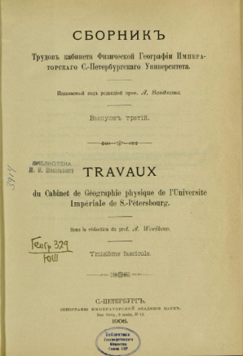 Сборник трудов Кабинета физической географии Императорского С.-Петербургского университета. Вып. 3. / изд. под ред. проф. А. Воейкова. - Санкт-Петербург : Тип. Имп. Акад. наук, 1906