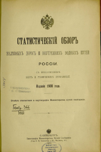 Статистический обзор железных дорог и внутренних водных путей России : с приложением карт и графических изображений / Г.Г. Ершов, В.К. Томашевский ; Отдел стат. и карт. Мин-ва путей сообщения. - Санкт-Петербург : Тип. М.П.С. (Т-ва И.Н. Кушнерев и Ко), 1900