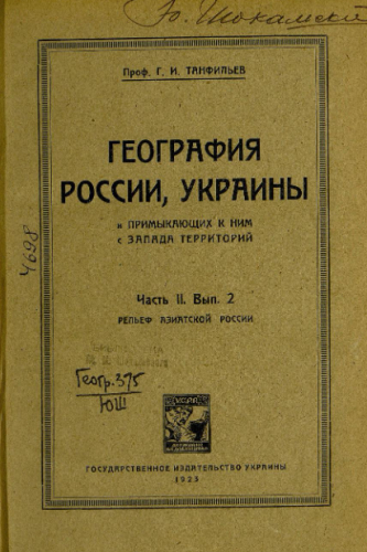 Танфильев, Гавриил Иванович (1857-1928). География России, Украины и примыкающих к ним с запада территорий в пределах России 1914 года. Ч. 2, Вып. 2 : Рельеф Азиатской России / проф. Г.И. Танфильев. - [Одесса] : Гос. изд-во Украины, 1923