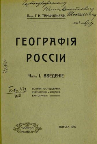 Танфильев, Гавриил Иванович (1857-1928). География России. Ч. 1 : Введение: История исследования. Учреждения и издания. Картография / проф. Г.И. Танфильев. - Одесса : Mathesis, 1916