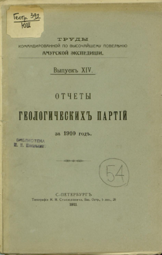 Труды командированной по высочайшему повелению Амурской экспедиции. Вып. 14 : Отчеты геологических партий за 1910 год. - Санкт-Петербург : Тип. М.М. Стасюлевича, 1911