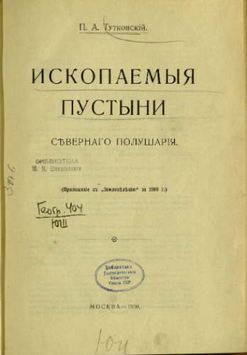 Тутковский, Павел Аполлонович (1858-1930). Ископаемые пустыни северного полушария / П.А. Тутковский. - Москва : Типо-лит. т-ва И.Н. Кушнерев и К°, 1910