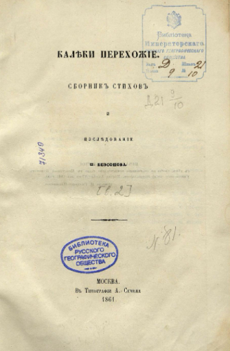 Бессонов, Петр Алексеевич (1828-1898). Калеки перехожие : Сборник стихов и исследование П. Безсонова. [Ч. 2]. - Москва : Тип. А. Семена, 1861