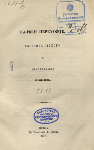 Бессонов, Петр Алексеевич (1828-1898). Калеки перехожие : Сборник стихов и исследование П. Безсонова. [Ч. 3]. - Москва : Тип. А. Семена, 1861