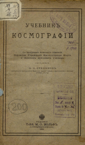 Степанов, Петр Петрович. Учебник космографии : по программе женских гимназий Ведомства учреждений императрицы Марии и женских духовных училищ / П.П. Степанов. - Санкт-Петербург ; Москва : Т-во М.О. Вольф, 1906