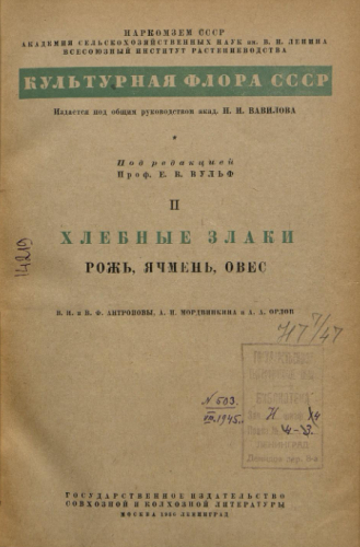 Культурная флора СССР. [Т.] 2 : Хлебные злаки : рожь, ячмень, овес / Наркомзем ; ВИР ; под общ. рук. акад. Н.И. Вавилова ; под ред проф. Е.В. Вульф. - Москва ; Ленинград : Гос. изд-во совхоз. и колхоз. лит-ры, 1936