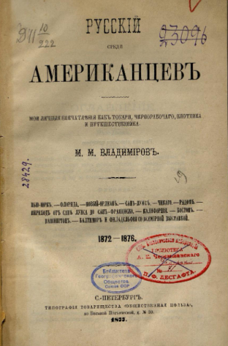 Владимиров М. М. Русский среди американцев : Мои личные впечатления как токаря, чернорабочего, плотника и путешественника. 1872-1876 / М.М. Владимиров. - Санкт-Петербург : тип. т-ва "Обществ. польза", 1877