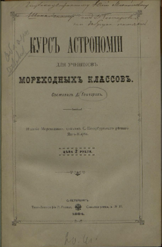 Гончаров, Дмитрий Максимович. Курс астрономии для учеников мореходных классов / Сост. Д. Гончаров. - Санкт-Петербург : Изд. Мореходных классов С.-Петерб. речного яхт-клуба, 1894