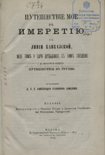Соколов, Александр Егорович (1780-1819). Путешествие мое в Имеретию с линии кавказской, мое там у царя пребывание, с ним сношение и обратное оттуда путешествие в Грузию / Соч. д.с.с. Александра Егоровича Соколова. - Москва : О-во истории и древностей рос. при Моск. ун-те, 1874