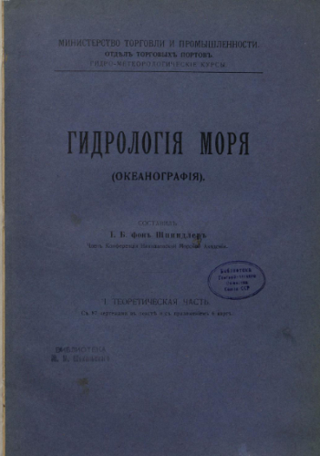 Шпиндлер, Иосиф Бернардович (1848-1919). Гидрология моря : (Океанография). [Ч.] 1 : Теоретическая часть / Сост. И.Б. фон Шпиндлер, чл. Конф. Николаев. мор. акад.; М-во торг. и пром. Отд. торг. портов. Гидрометеорол. курсы. - Петроград : Гос. тип., 1914