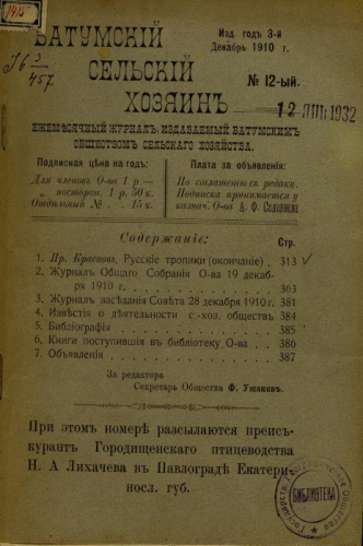 Батумский сельский хозяин. 1910, № 12. - Батум : Батумское общ. сельского хоз-ва, 1910