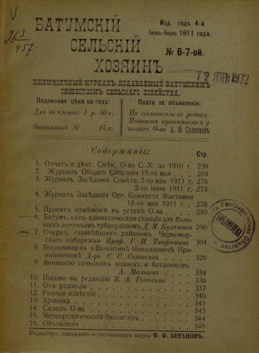 Батумский сельский хозяин. 1911, № 6-7. - Батум : Батумское общ. сельского хоз-ва, 1911