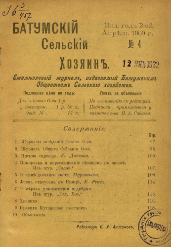 Батумский сельский хозяин. 1909, № 4. - Батум : Батумское общ. сельского хоз-ва, 1909
