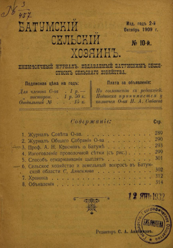 Батумский сельский хозяин. 1909, № 10. - Батум : Батумское общ. сельского хоз-ва, 1909