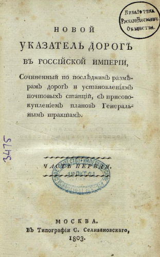 Новый указатель дорог в Российской империи. Ч. 1-2. / соч. по последним размерам дорог и установлениям почтовых станций, с присовокуплением планов генеральным трактам. - Москва : В тип. С. Селивановского, 1803
