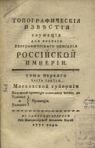 Топографические известия, служащие для полного географического описания Российской империи. Т. 1, Ч. 3 : Московской губернии Калужской провинции остальная часть, да Тульская и Углицкая провинции. - Санкт-Петербург : При Имп. Акад. наук, 1772