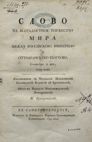 Суворов, Прохор Игнатьевич (1750-1815). Слово на всерадостное торжество мира между Российской империей и Оттоманской Портой, сентября 2 дня, 1793 года / Сказанное в Морском шляхетном кадетском корпусе в Кронштадте, оного же Корпуса инспекторским помощником П. Суворовым. - Санкт-Петербург : Тип. Корпуса чужестранных единоверцев, 1794