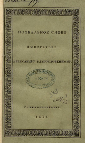 Ширинский-Шихматов, Платон Александрович (1790-1853). Похвальное слово императору Александру Благословенному / чит. в Имп. Российской Академии 11 сентября 1831 года, чл. сей Акад. и разных ученых о-в, кн. Платоном Ширинским-Шихматовым. - Санкт-Петербург : В тип. Имп. Рос. акад., 1831