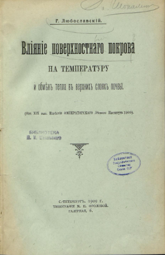 Любославский, Геннадий Андреевич (1860-1915). Влияние поверхностного покрова на температуру и обмен тепла в верхних слоях почвы / Г. Любославский. - Санкт-Петербург : Тип. М.П. Фроловой, 1909