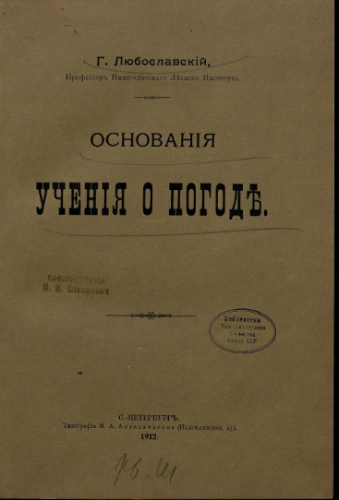 Любославский, Геннадий Андреевич (1860-1915). Основания учения о погоде / Г. Любославский. - Санкт-Петербург : тип. М.А. Александрова, 1912