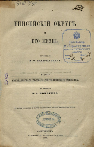 Кривошапкин, Михаил Фомич (1829-1900). Енисейский округ и его жизнь / Соч. М.Ф. Кривошапкина ; изд. ИРГО на ижд. В.А. Кокорева. - Санкт-Петербург : Тип. В. Безобразова и комп., 1865