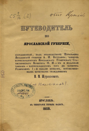Никольский, Федор Яковлевич (1816-1880). Путеводитель по Ярославской губернии / Сост. под руковод. Начальника Ярославской губернии А.П. Бутурлина чл. корр. Ярослав. Губ. стат. ком. Ф. Н-м и изд... Н.М. Журавлевым. - Ярославль : Тип. Германа Фальк, 1859